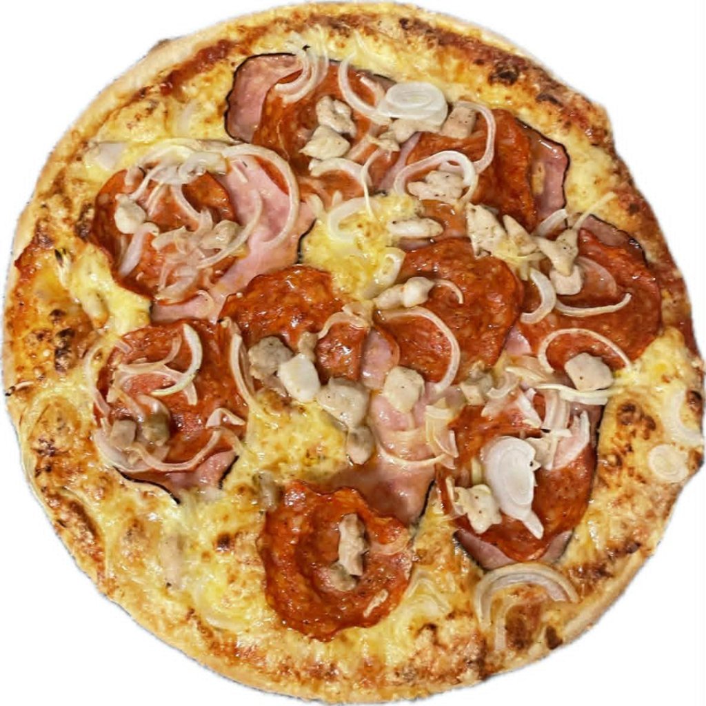 pomodoro, sýr, slanina, pikantní salám, kuřecí a vepřové maso, cibule, mozzarella, oregáno