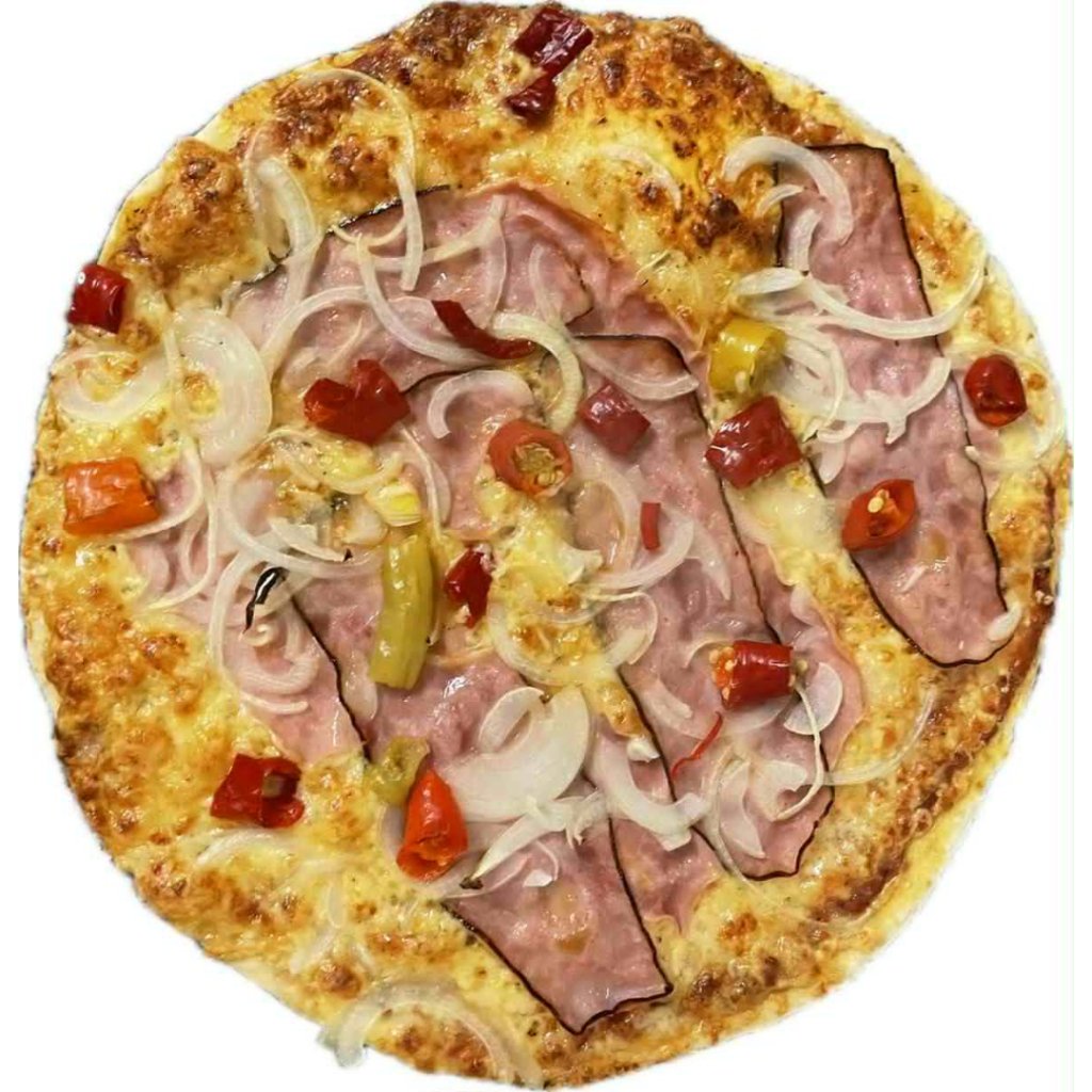 pomodoro, sýr, slanina, šunka, cibule, beraní rohy, mozzarella, oregáno