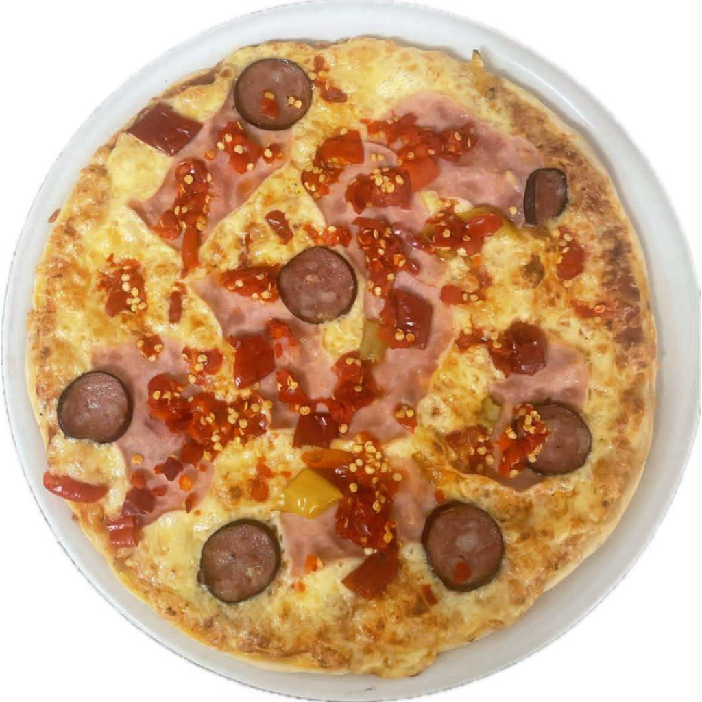 pomodoro, sýr, šunka, klobása, beraní rohy, feferonky, mozzarella, oregáno