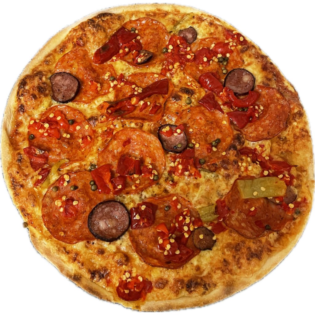 pomodoro, sýr, pikantní salám, klobása, beraní rohy, feferonky, zelený pepř, mozzarella, oregáno