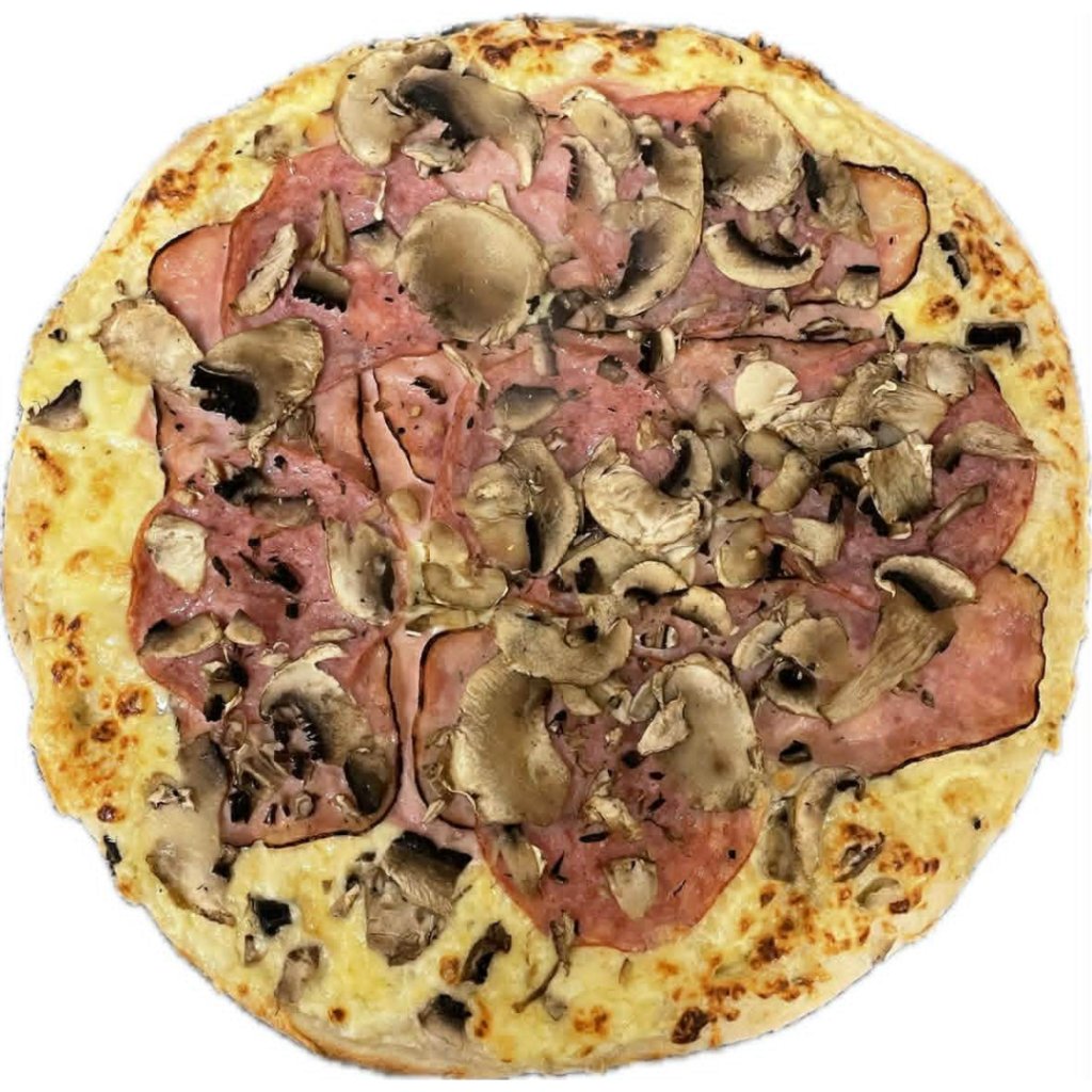 smetana, sýr, šunka, salám, slanina, žampiony, mozzarella, oregáno