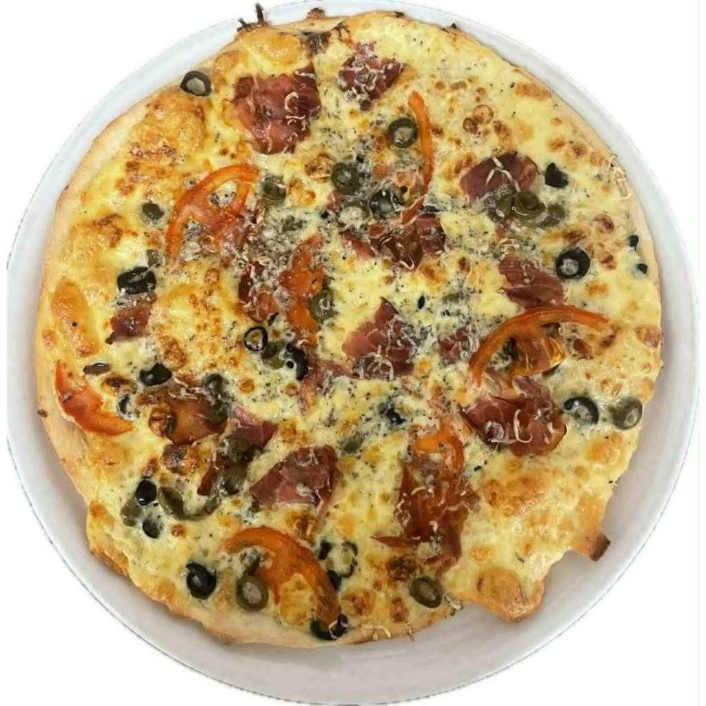 smetana, sýr, tyrolský špek, rajče, olivy, niva, mozzarella, oregáno