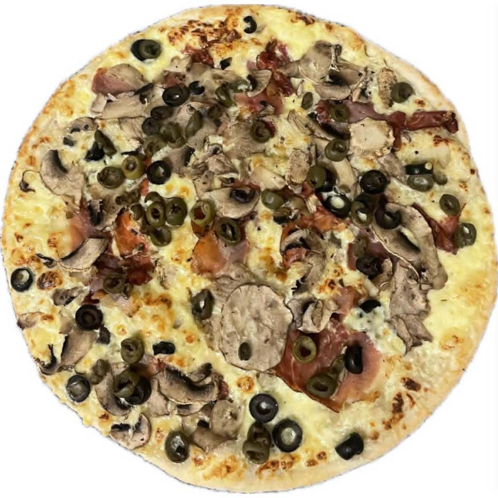 smetana, sýr, tyrolský špek, žampiony, olivy, mozzarella, parmazán, oregáno